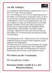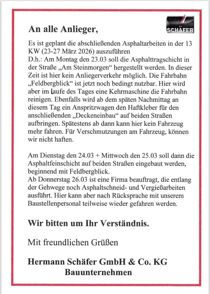 Asphaltarbeiten in Bermbach ab 23. März 2026 in den Straßen “Feldbergblick” und “Am Steinmorgen”19.03.202619.03.2026