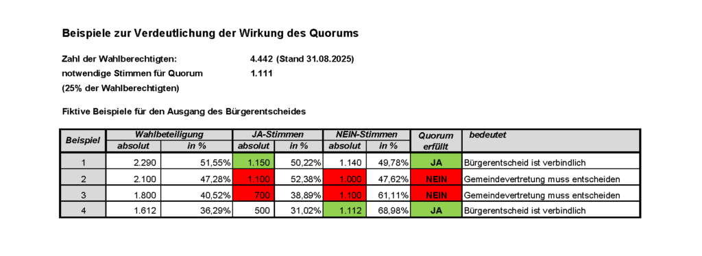 - und gleichzeitig müssen für die Mehrheitsmeinung mindestens 25 Prozent aller Wahlberechtigten gestimmt haben. Nur dann ist das Quorum erfüllt.
